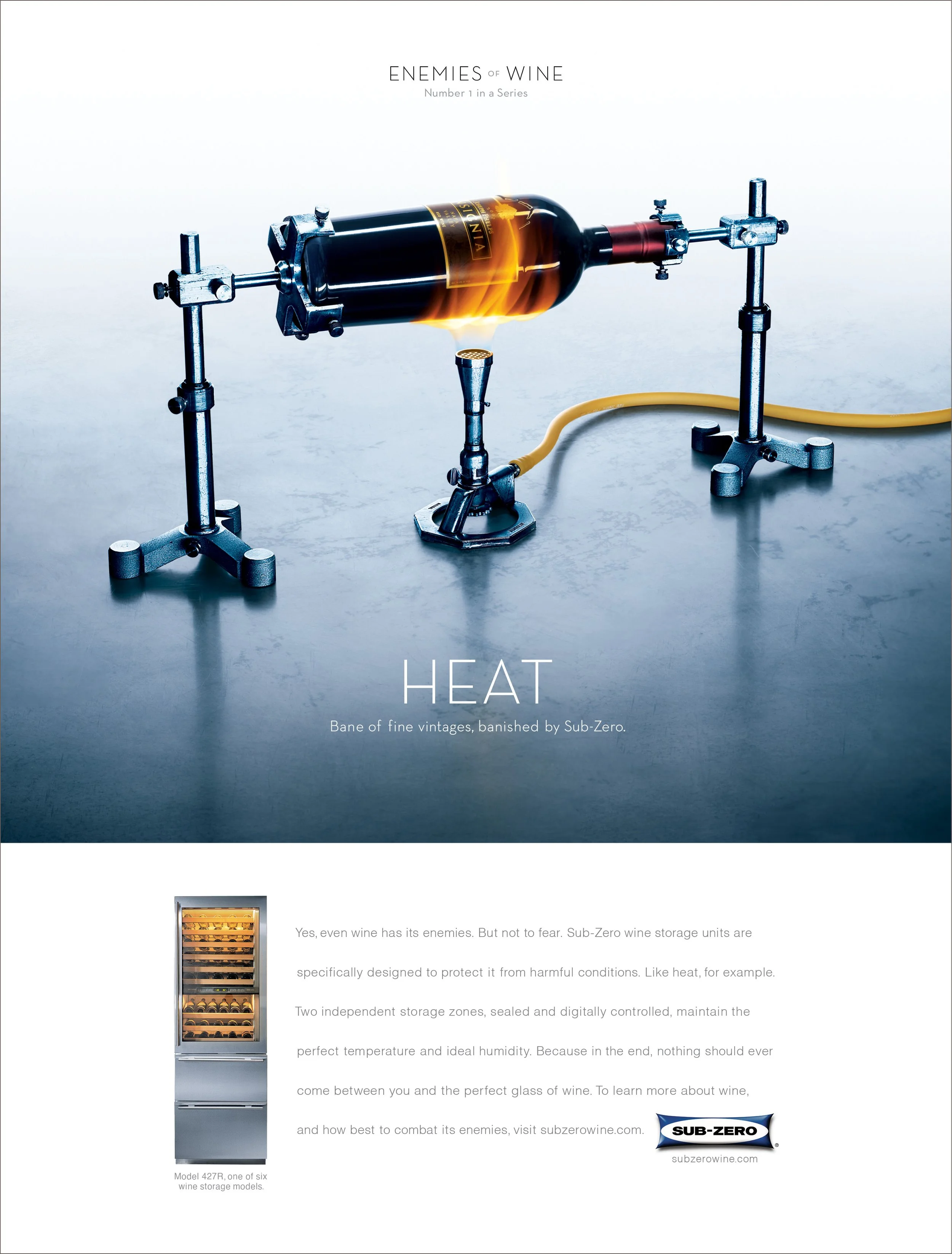 Headline: HEAT Bane of fine vintages, banished by Sub-Zero. CD: Dennis Walker, David Culp, AD: Shane Altman, CW: Mike Bales